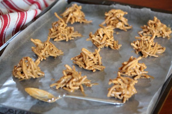 Marshmallow cream, peanut butter and butterscotch chips, all melted and cover chow mein noodles. Sold by the dozen